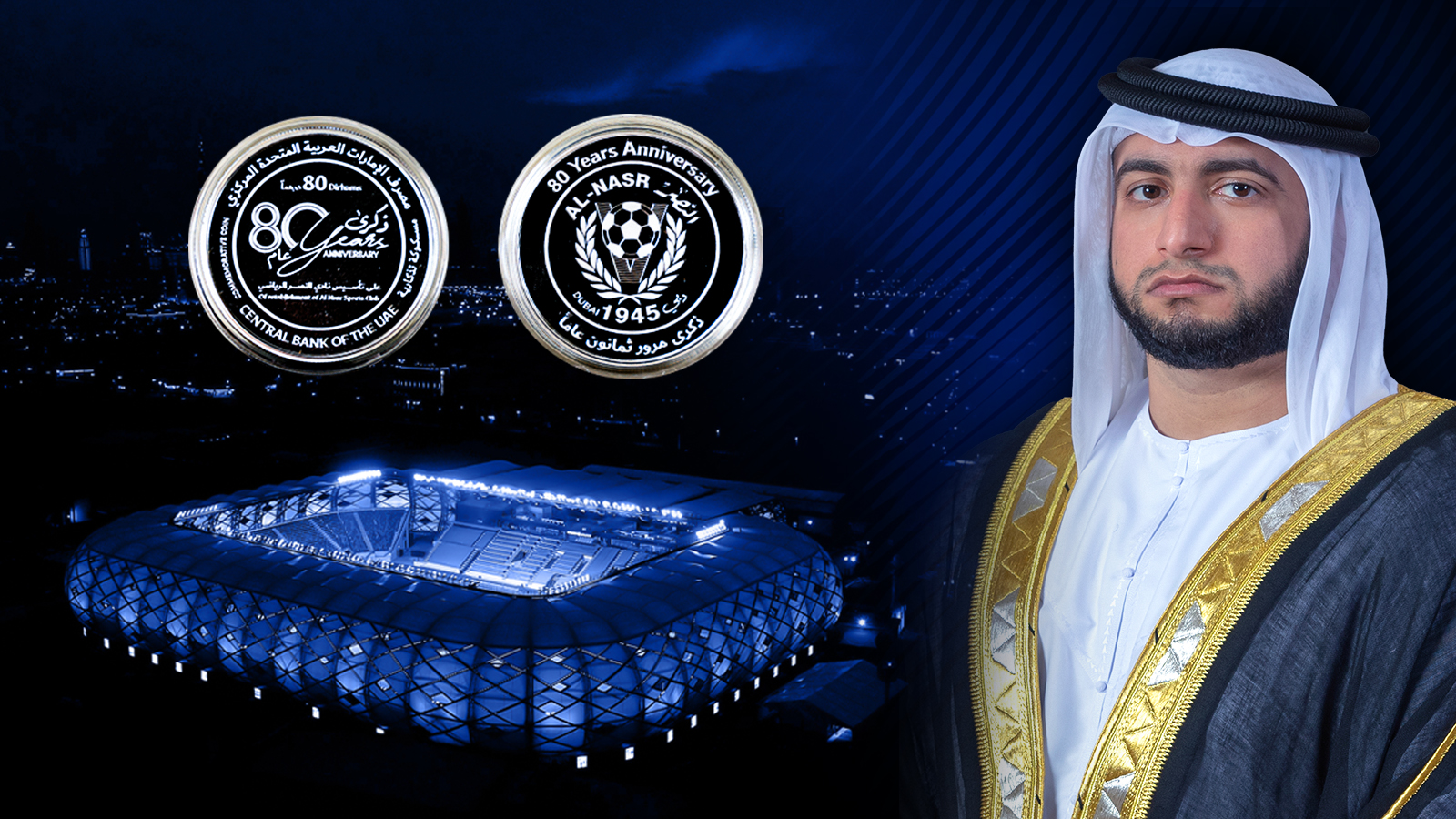 يُعلن نادي النصر الرياضي عن إطلاق مسكوكة تذكارية بالتعاون مع مصرف الإمارات العربية المتحدة المركزي، وذلك في إطار احتفالات "عميد الأندية" بمرور ثمانين عاماً على تأسيسه، وتوثيقاً لهذه المناسبة الاستثنائية في مسيرة مجدٍ خالدة سُطّرت بحروفٍ من نور في سجل الرياضة الإماراتية، ورُسمت كعلامة مضيئة في تاريخ الرياضة الخليجية والعربية.